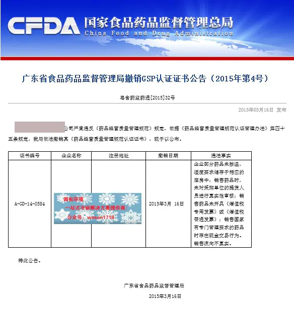3月16日,廣東省食品藥品監督管理局再次發出了撤銷某某藥業GSP認證證書公告。